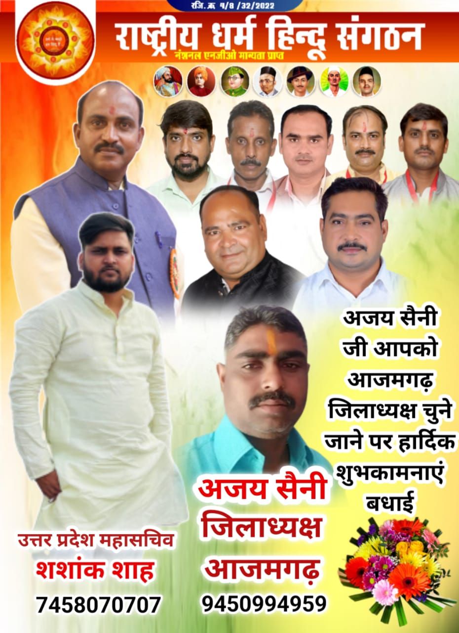 राष्ट्रीय धर्म हिंदू संगठन के संस्थापक राष्ट्रीय अध्यक्ष आदरणीय संजय श्याम लाल माली जी के आदेश अनुसार एवं राष्ट्रीय संगठन मंत्री कमलेश यादव जी के मार्गदर्शन में उत्तर प्रदेश के महासचिव शशांक शाह जी ने आजमगढ़ जिला अध्यक्ष अजय सैनी जी को नियुक्त किया है शुभकामना देते हुए राष्ट्र कमेटी एवं महाराष्ट्र अध्यक्ष सुनील सिंह जी राष्ट्र कमेटी के पदाधिकारी उपाध्यक्ष मुनीम सैनी संगठन मंत्री संत कुमार जी सचिव एवं प्रवक्ता धर्मेंद्र पांडे जी कोषाध्यक्ष नीरज माली की कार्यवाहक राजकुमार प्रजापति जी उत्तर प्रदेश जौनपुर जिला अध्यक्ष सुनील मधुकर जी सभी के तरफ से अजय सैनी जी को जो आजमगढ़ जिला अध्यक्ष चुने जाने पर ढेर सारी बधाइयां एवं शुभकामनाएं