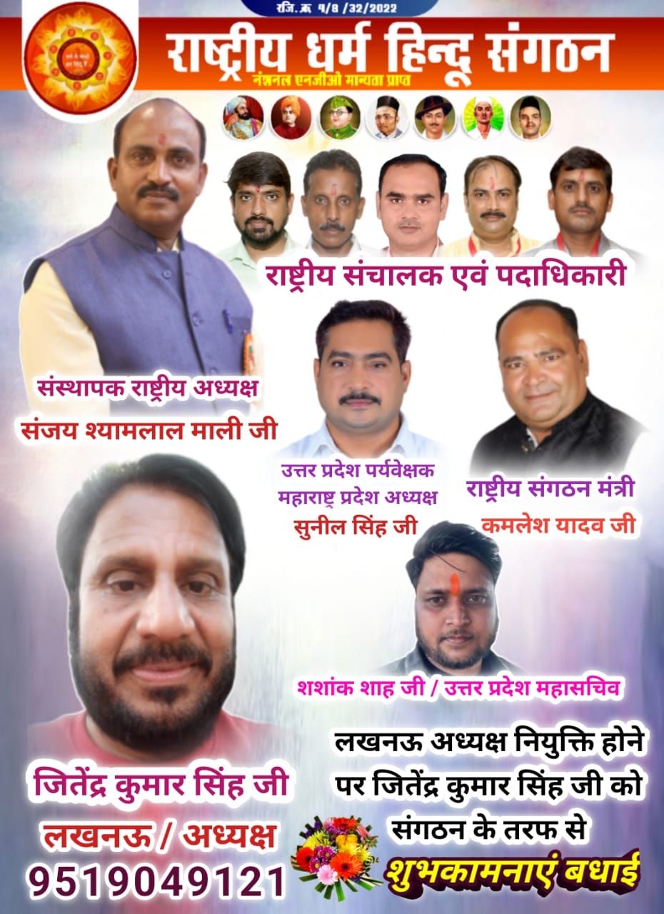 राष्ट्रीय संगठन मंत्री कमलेश यादव जी एवं उत्तर प्रदेश पर्यवेक्षक एवं महाराष्ट्र प्रदेश अध्यक्ष सुनील सिंह जी के अधिकार का सम्मान करते हुए राष्ट्रीय धर्म हिंदू संगठन के संस्थापक राष्ट्रीय अध्यक्ष संजय श्यामलाल माली जी ने राष्ट्रीय संगठन मंत्री कमलेश कुमार यादव जी को नियुक्ति का अधिकार दे दिए लखनऊ अध्यक्ष जितेंद्र कुमार सिंह जी को नियुक्त किया गया है संगठन के राष्ट्रीय पदाधिकारी उपाध्यक्ष मुनीब सैनी जी महासचिव संत कुमार सैनी जी सचिव एवं प्रवक्ता पत्रकार धर्मेंद्र पांडे जी कोषाध्यक्ष नीरज माली जी कार्यवाहक राजकुमार प्रजापति जी उत्तर प्रदेश के महासचिव शशांक शाह जी सभी के तरफ से जितेंद्र कुमार सिंह जी को ढेर सारी शुभकामनाएं एवं बधाई