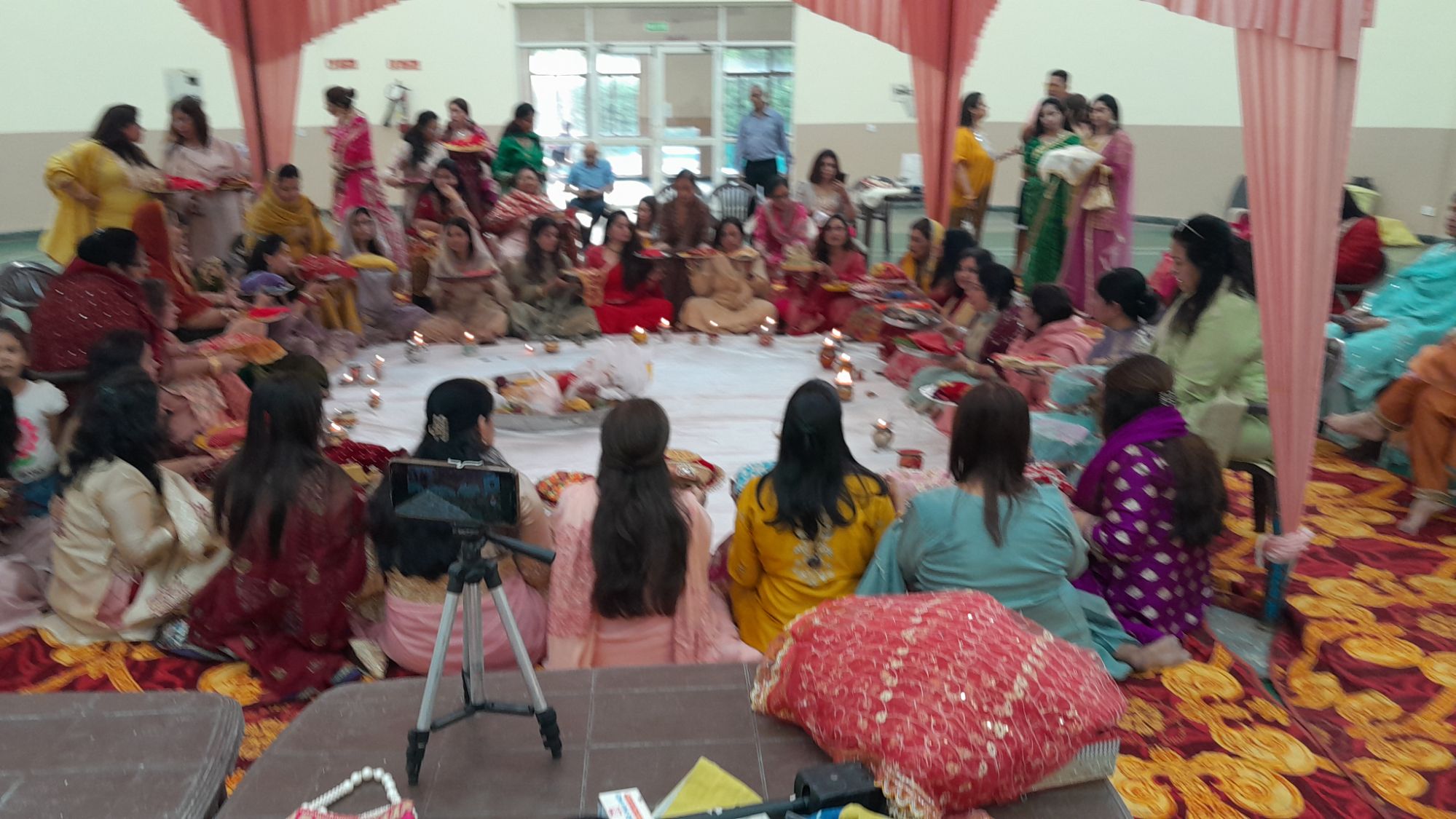 इस आयोजन में 51- 51 महिलाओं के समूह में वृताकार बैठ कर ,सभी महिलाओं ने सम्पूर्ण विधि विधान से करवा चौथ की पूजा की व कथा सुनी !