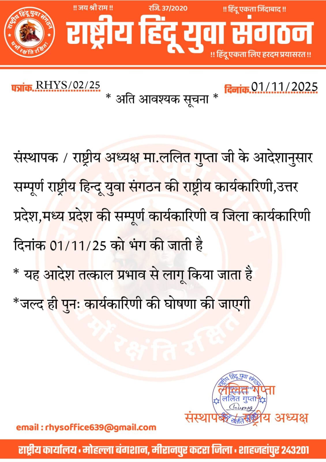 आई आपको बताते चलें राष्ट्रीय हिंदू युवा संगठन के राष्ट्रीय अध्यक्ष एवं संस्थापक माननीय ललित गुप्ता जी ने राष्ट्रीय हिंदू युवा संगठन की राष्ट्रीय कमेटी मध्य प्रदेश की संपूर्ण कमेटी उत्तर प्रदेश के संपूर्ण कमेटी एवं जिला कमेटी को तत्काल प्रभाव से भंग कर दिया है और माननीय अध्यक्ष जी ने बताया है की बहुत ही जल्द नई कमेटी का विस्तार किया जाएगा और फिर नई जोश के साथ राष्ट्रीय हिंदू युवा संगठन का एक कार्यकर्ता कार्य करेगा और फिर हिंदू एकता का वही जोश के साथ कार्य किया जाएगा और बताया की अब कमेटी ऐसी बनाई जाएगी जो सच में हिंदुत्व के लिए तैयार हैं हिंदू एकता के लिए तैयार हैं और उन्होंने कहा है की बहुत ही जल्द नई कमेटी की लिस्ट जारी की जाएगी और पुनः फिर राष्ट्रीय हिंदू युवा संगठन जिस तरीके से कार्य करता चला आ रहा है बही कार्य करना चालू कर देगा