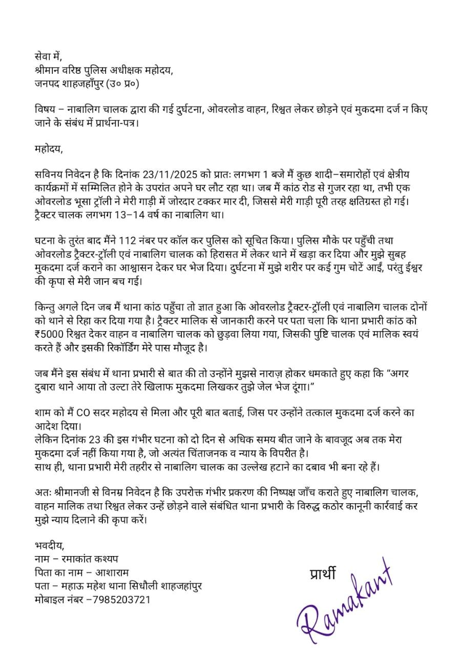 खबर जनपद शाहजहांपुर से दिनांक 23/11/25 को सुबह करीब 1बजे मैं कुछ शादी-समारोह, क्षेत्रीय कार्यकर्मों में सम्मिलित होने के बाद अपने घर लौटते समय कांठ रोड पर एक ओवरलोड भूसा ट्रॉली ने मेरी गाड़ी में टक्कर मार दी, जिससे मेरी गाड़ी पूरी तरह क्षतिग्रस्त हो गई। ट्रैक्टर चालक लगभग 13/14 वर्ष का नाबालिग था घटना के बाद मैंने तुरन्त 112 नंबर के माध्यम से पुलिस को सूचित किया और मौके पर पहुंच कर पुलिस ने तुरंत ड्राईवर सहित ओवरलोड ट्रैक्टर ट्रॉली को हिरासत में लेकर थाने में खड़ा कर लिया और मुझे पूरी तरह से न्याय देने ओर सुबह मुक़दमा दर्ज कराने का विश्वास दिलाकर घर भेज दिया दुर्घटना के कारण शरीर में कुछ गुम चोटें आई है लेकिन आप सभी के आशीर्वाद से मेरी जान बच गई है लेकिन कल सुबह जब मैं मुकदमा दर्ज कराने कांठ थाने पहुंचा तो ओवरलोड ट्रैक्टर और नाबालिग ड्राईवर दोनों थाने से रिहा हो चुके थे ट्रैक्टर मालिक से जानकारी लेने पर चला कि पुलिस को 5000/ रुपए की रिश्वत देकर ट्रैक्टर और नाबालिग ड्राईवर दोनों को छुड़ाकर ले गया है मैने इस बारे में थाना प्रभारी जी से बात की तो प्रभारी जी ने नाराज होकर मुझे धमकाते हुए कहा कि अगर दुबारा थाने में आया तो उल्टा मुकदमा तेरे खिलाफ लिखकर तुझे जेल भेज दूंगा रूपए 5000/ रिश्वत लेने वाली बात की सारी रिकॉर्डिंग मेरे पास मौजूद है कल शाम को जब हमने CO सदर साहब से मिलकर अपनी समस्या के बारे में बताया तो CO साहब ने तुरन्त हमारा मुक़दमा दर्ज करने का आदेश दिया लेकिन लगभग 48 घंटे बीत जाने के बाद भी अभी तक मेरा मुक़दमा दर्ज नहीं किया गया है अब थाना प्रभारी जी मेरी तहरीर से नाबालिग ड्राईवर का जिक्र हटाने का जोर दे रहे हैं